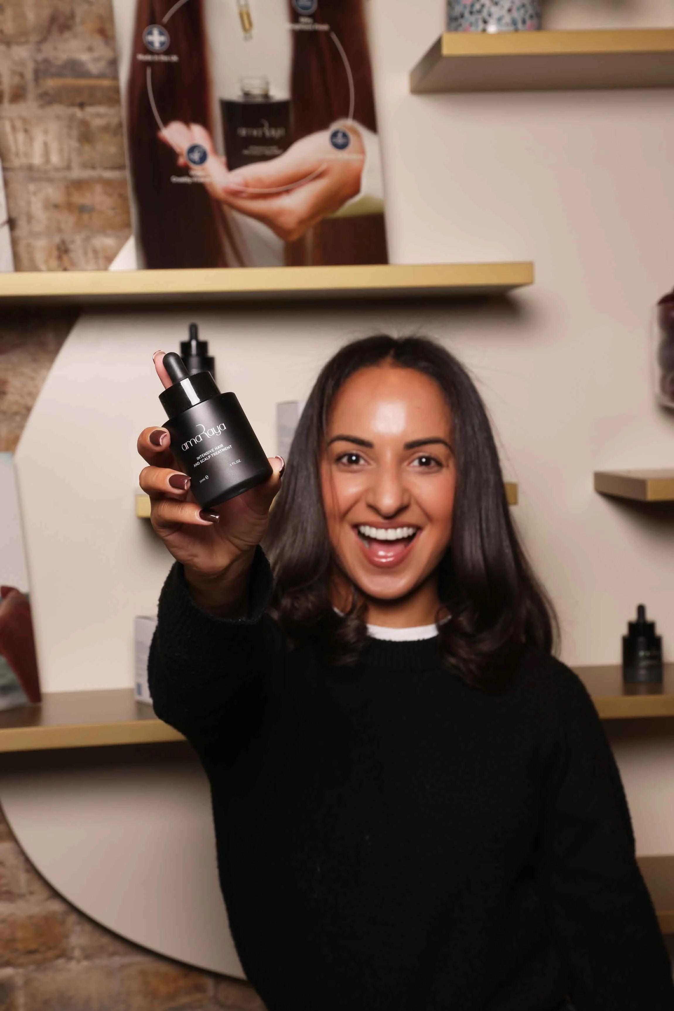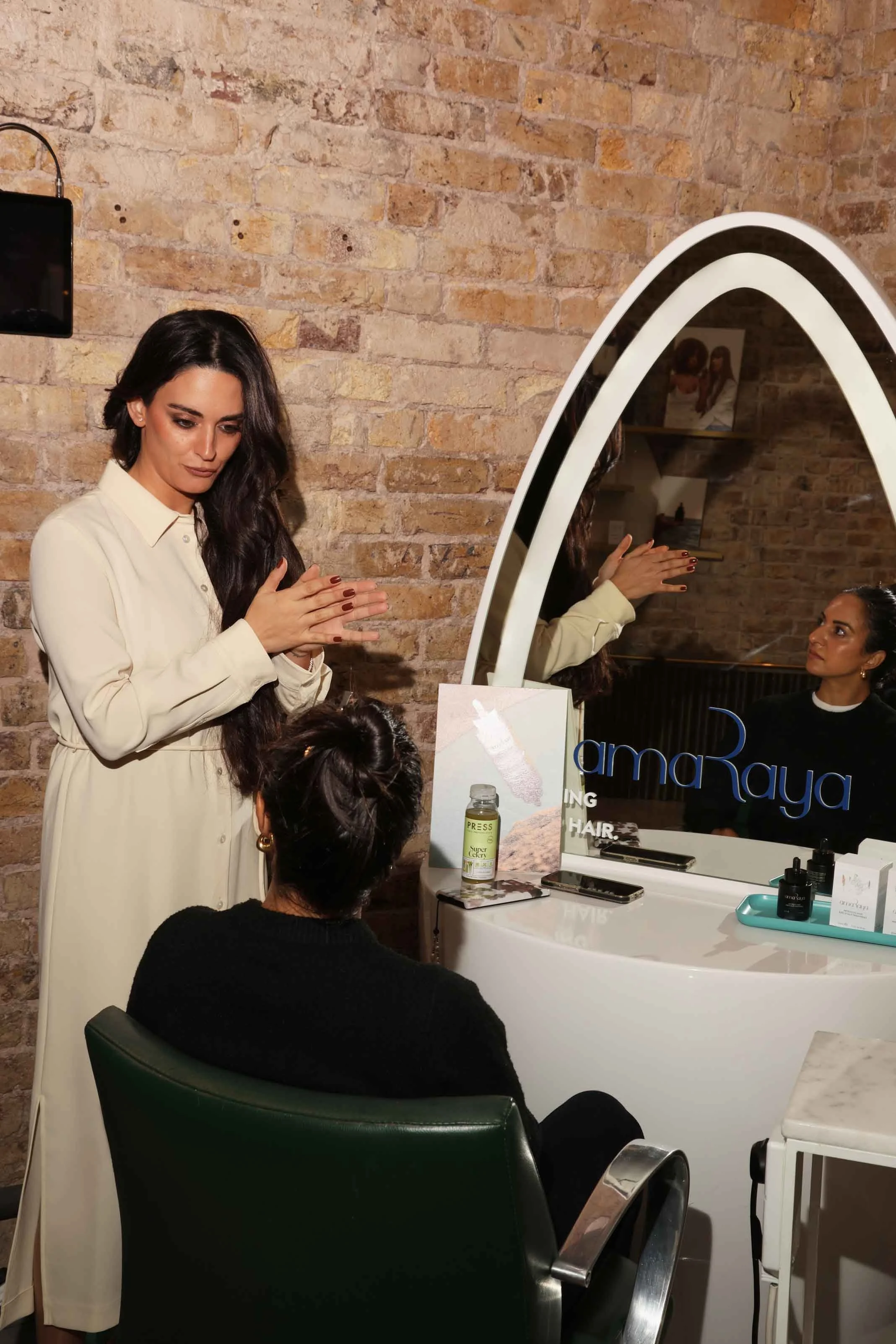 Hosted in Mayfair’s Duck & Dry salon, the space was transformed into a fully branded AmaRaya destination, from bold exterior vinyls to mirror decals at every station. Elevated product displays showcased hero campaign visuals and key ingredient stories, immersing guests in the brand world from the moment they arrived.